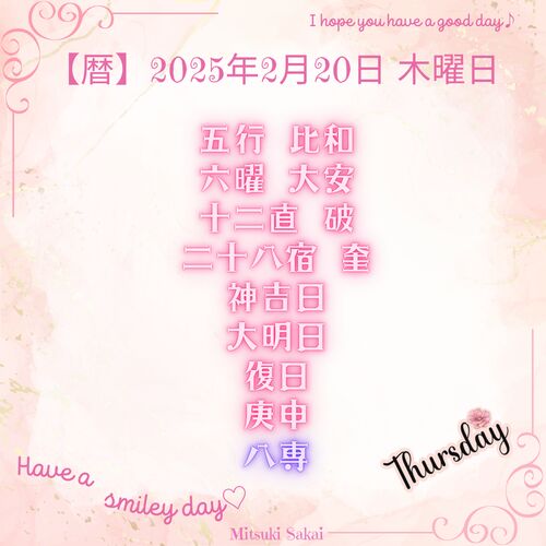 Thursday,February 20,2025 五行 比和 六曜 大安 十二直 破 二十八宿 奎 神吉日 大明日 八専 mechacomic.jp ランキング参加中働き女子のためのコミュニティ