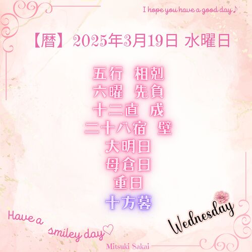 Wednesday,March 19,2025 五行 相剋 六曜 先負 十二直 成 二十八宿 壁 大明日 母倉日 十方暮 mechacomic.jp ランキング参加中はてな女子