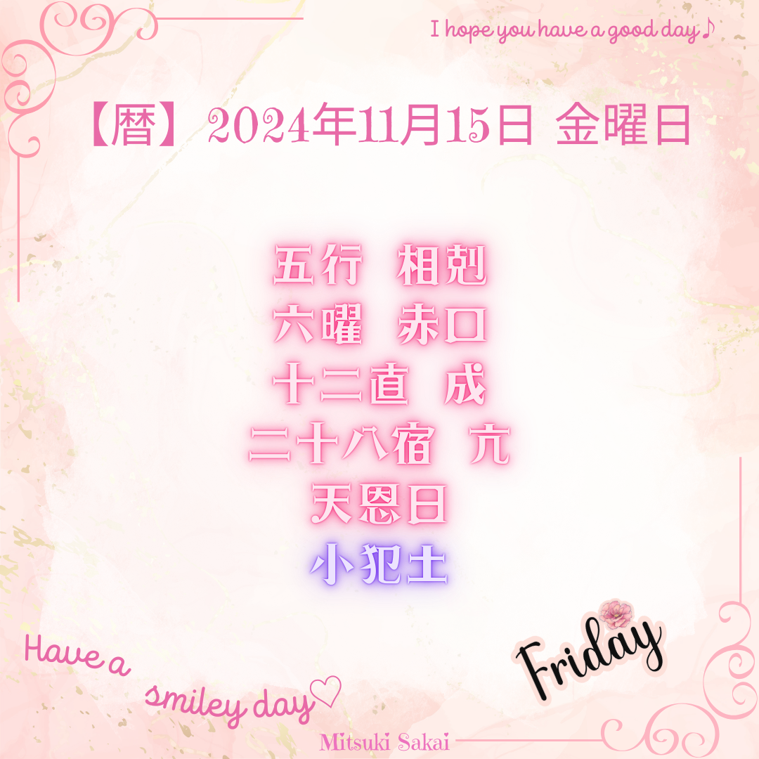 2024-11-14 【暦】2024年11月15日 金曜日 ゆるらいふ エッセイ Friday,November 15,2024 五行 相剋 六曜 赤口 十二直 成 二十八宿 亢 天恩日 小犯土 【七五三】七五三は7歳、5歳、3歳の子の成長を祝う行事です。 かつては11月15日の鬼宿日(旧暦での吉日)に行われましたが、現在ではこの日に限らず、10月から11月中の土日や吉日に行なわれることが多くなっています。 子の成長を祝い、晴れ着を着て神社に参拝し、長寿を願い細長く切られた紅白の千歳飴を食べる風習があります。 ランキング参加中30代40代女性のつぶやき